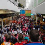 Den Vormittag verbrachten wir damit, uns durch Helsinki zu schlängeln. Die Sprache kann man weder lesen noch schreiben, geschweige denn aussprechen. Überall treffen wir begeisterte Teilnehmer aller Nationen. Wir sind mittendrin im Trubel. Schnell sind die Ersten den „falschen“, aber gleichen Rucksäcken hinterhergelaufen. Wir hatten große Mühe, alle zusammen zu halten. Es wurde aber noch verrückter. Wir suchten unsere Mittagsversorgung in den Messehallen, zusammen mit weiteren zig tausenden Teilnehmern aller Nationen. Wir staunten über Australien, Südafrika, China, Neuseeland… Alles tobte, turnte, sang und jodelte durch die Hallen. Unglaublich und die ersten Eindrucke überwältigten uns. Wir schafften es bei aller Begeisterung unser Mittag dennoch einzunehmen. Während der kurzen „ Ruhepause“ überlegte unsere Reiseleiterin Moni wie wir nun am Besten das Stadion für die Eröffnungsveranstaltung finden. So schwer war es gar nicht, immer der Masse hinterher und schön seinen Vordermann fixieren. Ein Fußmarsch durch die Stadt führte uns zu unserem Stellplatz – und schon war wieder was geschafft!! Nun trudelten viele Nationen auf unserem Sammelplatz ein. Schweizer, Amis, Finnen – und aus den Lautsprechern dröhnte das erste mal der Gymnaestrada-Song und zugleich tanzten alle Nationen gemeinsam los.
